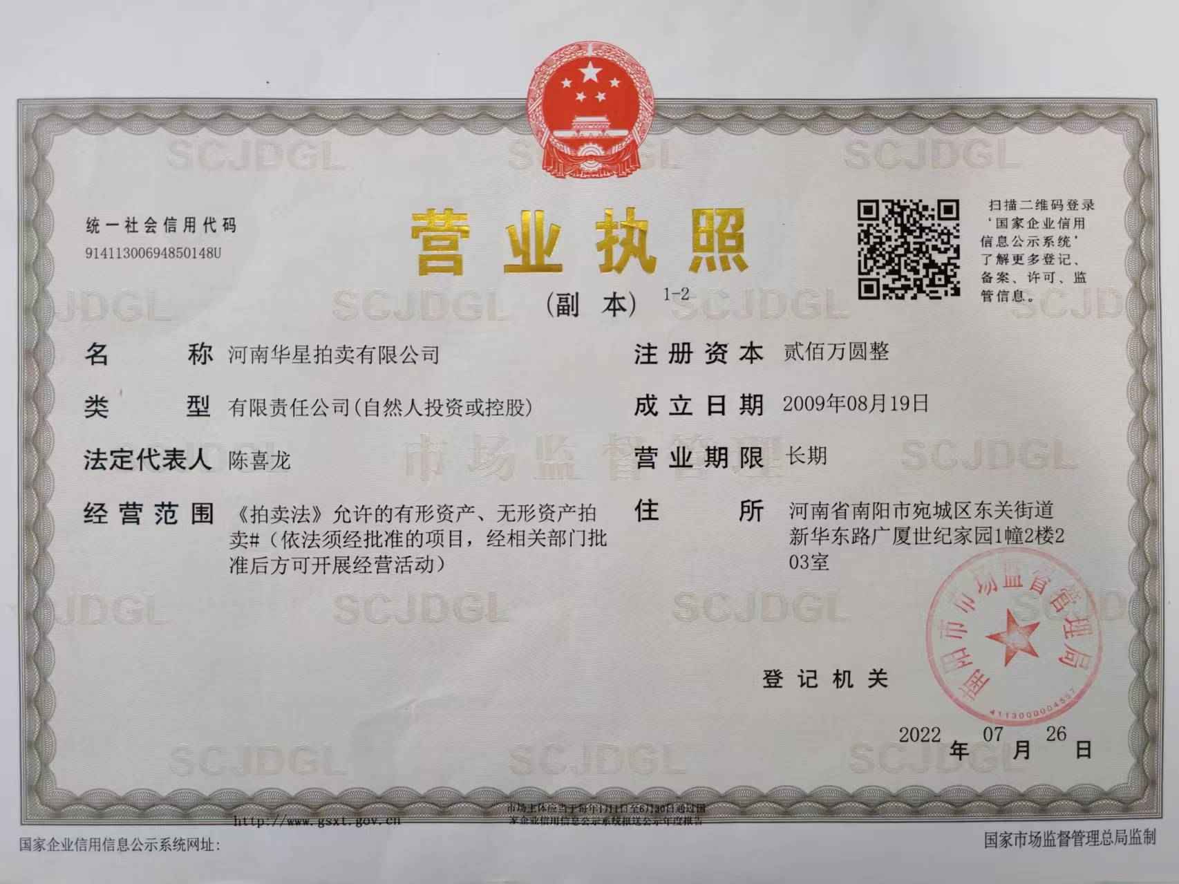 2013年7月取得南陽市人民政府指定、河南省財政廳頒發河南省公物拍賣資格證書
